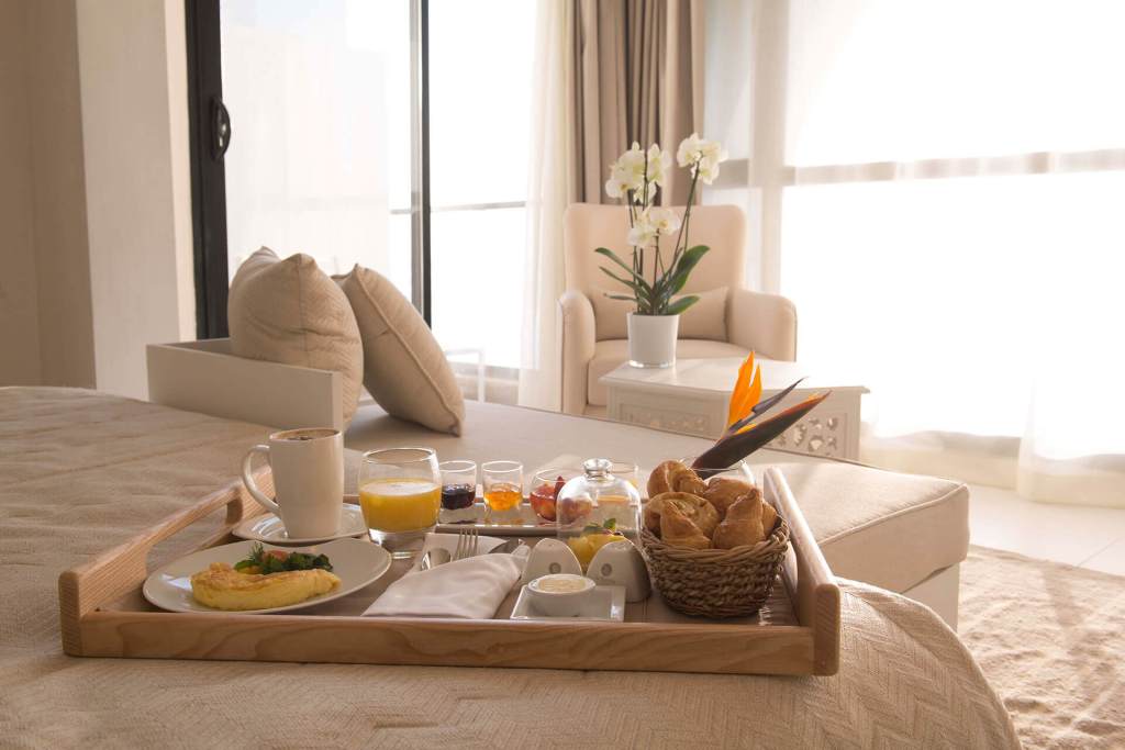 Dining at La Badira celebrates the bounty of the region with a contemporary twist. Overlooking the bay, Kamilah offers Mediterranean dishes prepared with fresh, seasonal ingredients, while the Adra restaurant reinvents Tunisian cuisine with a refined approach. The atmosphere reflects Tunisia’s elegant heritage, with sculpted ceilings and intricate details framing every meal. For a relaxed experience, the Beach Grill serves light, fresh fare by the sea, perfect for enjoying salads and grilled seafood while reclining on a sun lounger. In the mornings, the Zahila Terrace is a peaceful spot for breakfast, where local fruit preserves and freshly baked Tabouna bread complement the calm surroundings.